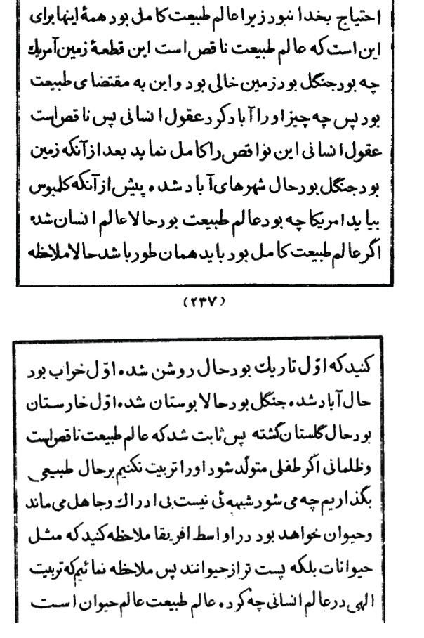 “What was this piece of land (called) America? It was a jungle, it was an empty land. This was due to (the work of) nature. What caused it to flourish? The reasons of the people. Thus (nature) is imperfect and the reasons of the people make it perfect. Previously it was an (empty) land now it has become (full) of prosperous cities. Before Columbus came it was the world of nature now it is the world of humans. If the world of nature was perfect it should have been like that (from the beginning). Pay attention that first it was dark now it is illuminated, first it was ruined now it is prosperous, first it was full of thorns now it is full of flowers. Thus it is proved that the world of nature is imperfect and dark. If a child is born and we do not nurture him and we abandon him in his natural state what will happen? Without a doubt, he will remain ignorant and without cognition and he will be an animal. Look at (the inhabitants of) central Africa who are like animals and even inferior. Thus we can see how divine nurturing influences the world of humanity. The world of nature is the world of the animal.”