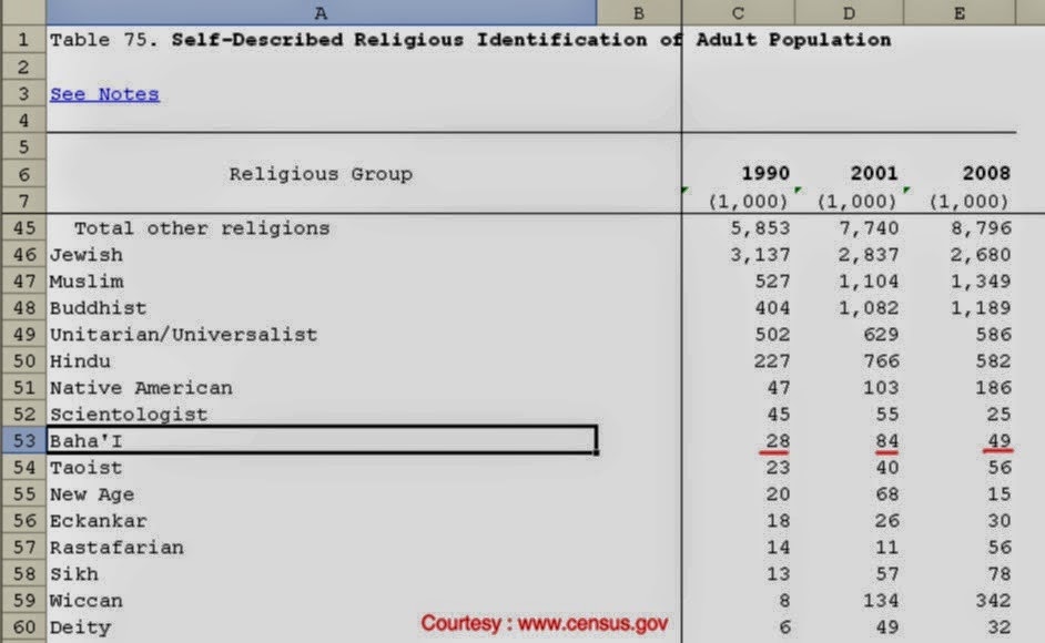 Bahais claim that there are 1,75,000 Baha’is in US. But the official census says something else. The official census of United States says that “there were 28,000 Baha’is in US in 1990, then in 2001 it figure went up to 84,000 (entry by troops?) then again in 2008 it dropped down to 49000 (exodus by troops!)”. Extract of official census is as under: