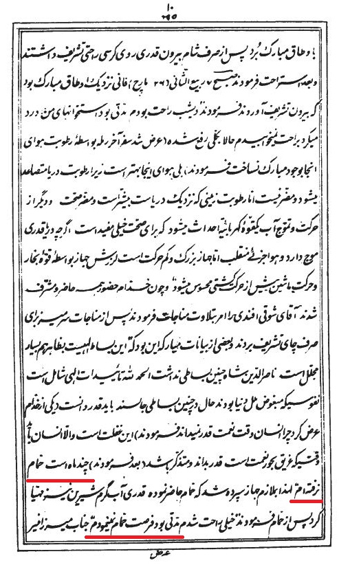 «چند ماه است حمام نرفته ام. لهذا بملازم جهاز سپرده شد که حمام حاضر نموده قدری آب گرم شیرین نیز مهیا کرد. پس از حمام فرمودند خیلی راحت شدم. مدتی بود فرصت حمام نمی نمودم.» (محمود زرقانی، بدایع الآثار، ج1، ص 10)