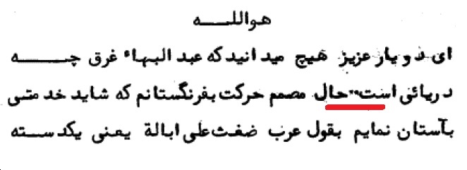 «ای دو یار عزیز هیچ می دانید که عبدالبهاء غرق چه دریایی است قسم به اسم اعظم روحی لعتبه الفداء که یکسال است یکدفعه فرصت یافتم که به حمام بروم دیگر ملاحظه نمایید که چه اوضاعیست حال مصمم حرکت به فرنگستانم که شاید خدمتی بآستان نمایم.»