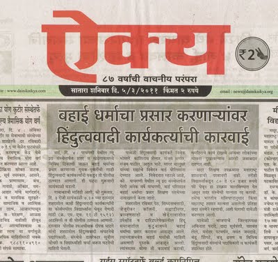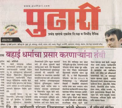 Wai, 4th March 2011 : On Thursday evening, Hindu activists caught the staff and students of New Era Institute who were engaged in teaching Bahai religion in city and nearby villages. They were then taken to the police station alongwith their vehicle.